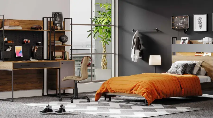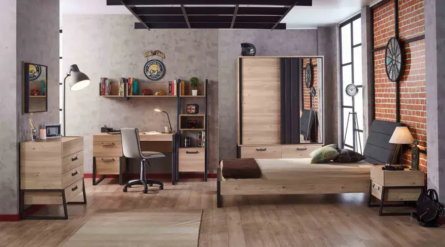 Blending the rebellious stance of metal and black glass with the compromise of gray, the Arwen Youth Room is the perfect choice for those who want to reflect their style in every detail.